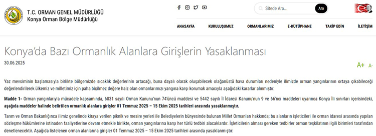 Konya’da uygulanacak ormanlık alanlara giriş yasağı tarihleri ise; 1 Temmuz 2025 ile 15 Ekim 2025 olarak bildirildi.
